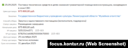 Нарешті, у вересні 2025 року «постачання технічних засобів з метою надання гуманітарної допомоги військовослужбовцям, які перебувають у зоні «СВО», оплатило на суму 875 тисяч рублів «Музейне агентство» – організація, що управляє трьома десятками невеликих музеїв у Ленінградській області (Ладозька фортеця, фортеця в Івангороді, будиночок няні Пушкіна та інші). Як і у випадку з Виборзьким музеєм, публічно ці постачання ніде не згадувалися.
