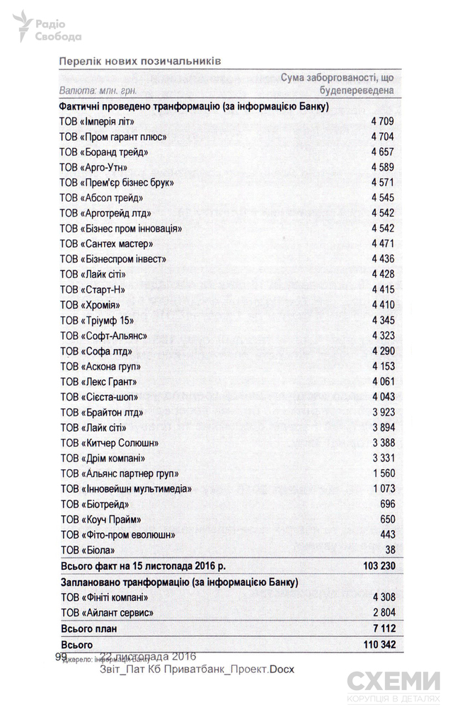 Напередодні націоналізації «Приватбанк» оформив 110 мільярдів гривень кредитів на понад 30 фірм, більшість із яких мають ознаки фіктивності. Такого висновку дійшли журналісти програми «Схеми», отримавши доступ та проаналізувавши аудиторський звіт про фінансово-господарську діяльність банку, складений аудиторською фірмою Ernst&Young.