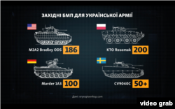 За даними проєкту Oryx, який відстежує поставки західної допомоги ЗСУ, саме західних БМП Україні пообіцяли відносно мало. США – майже дві сотні «Бредлі». Німеччина – сотню БМП Marder, але їх ще не ввели в бій. У майбутньому Польща надасть колісні БМП Rosomak, а Швеція вже відправила CV90.